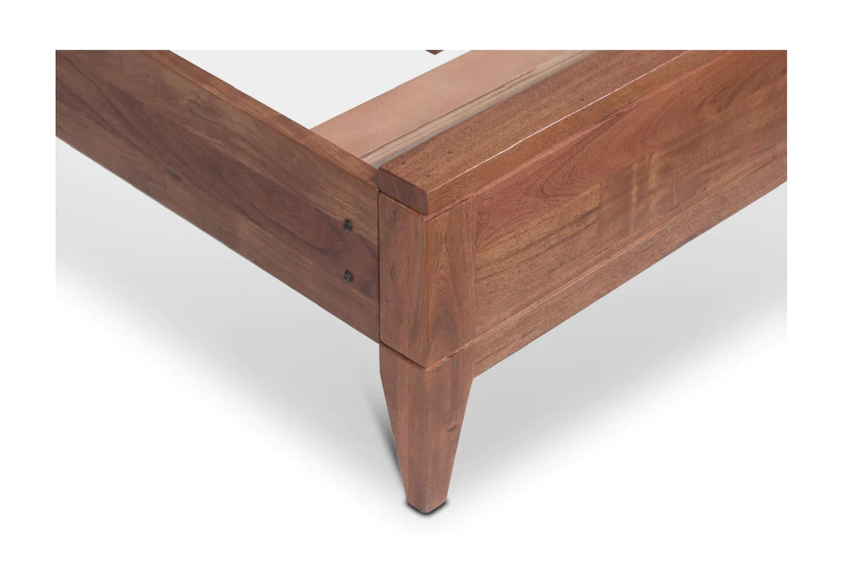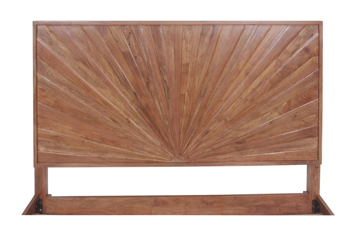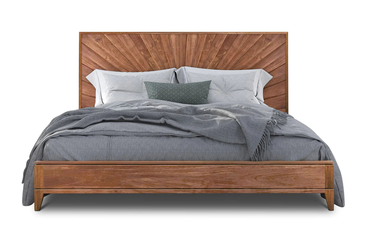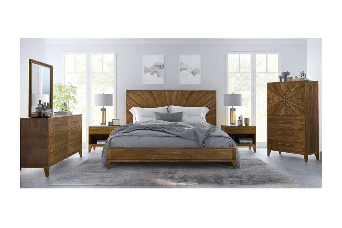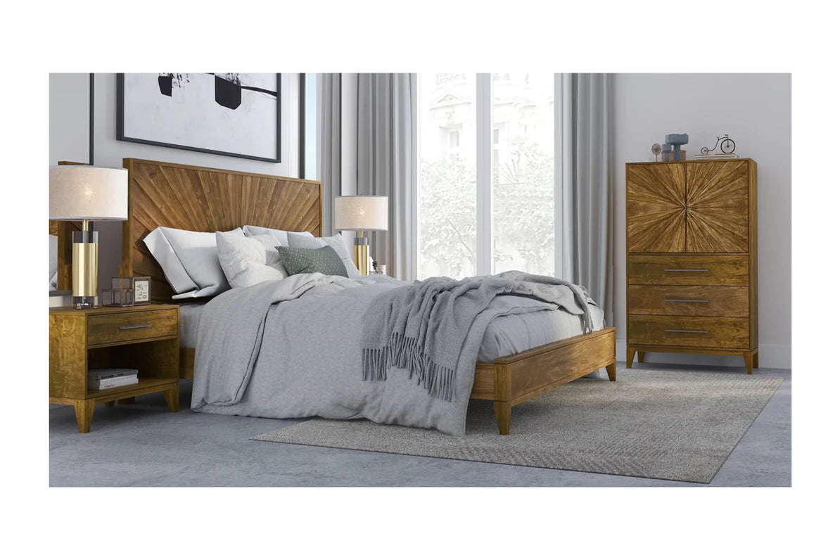 In a stunning display of natural craftsmanship, the Apt2B Skye Bed invites nature inside the home with ease. Created with warmly hued mango wood as the frame and base, and a beautifully arranged veneered sunburst pattern, this bed speaks to both contemporary, and old world styles. The natural variance in the wood grain makes each piece in this collection feel like one of a kind. Perfectly suited for a desert oasis or a big city loft, this modern bed is available in queen or king size, and has five support slats. Solid, tapered legs and attention to detail complete the look of this quality made collection. This bed does require a foundation or box spring. A matching Skye chest, dresser and nightstand are also available.